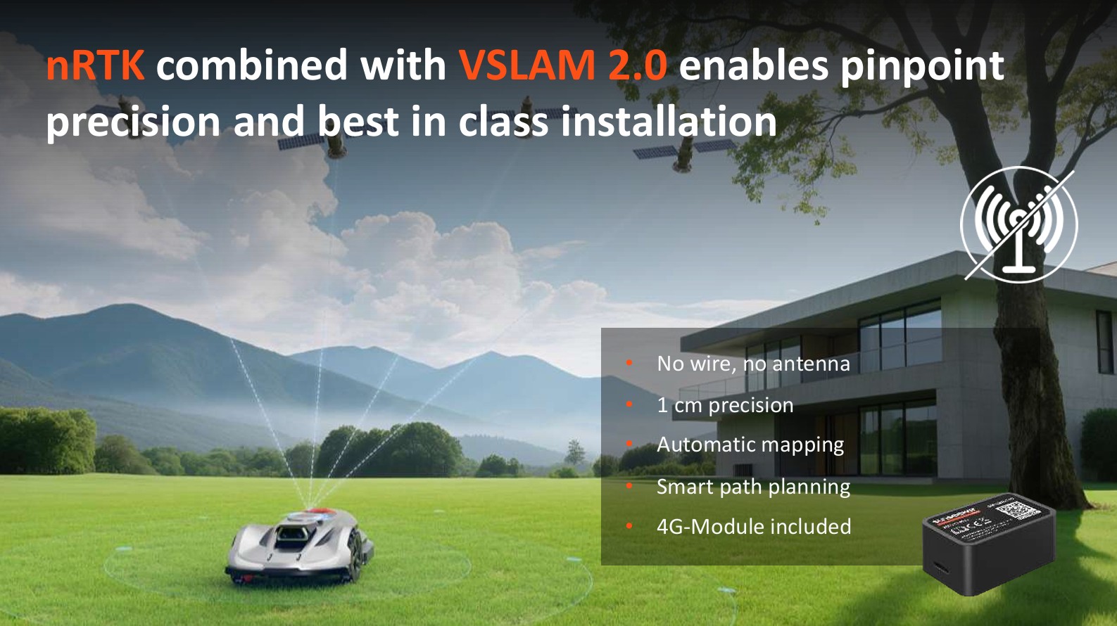 Lisäksi robotti pystyy jatkamaan työskentelyä jopa tilanteissa, joissa satelliittisignaali hetkellisesti heikkenee, koska VSLAM ja Vision AI tukevat paikannusta.