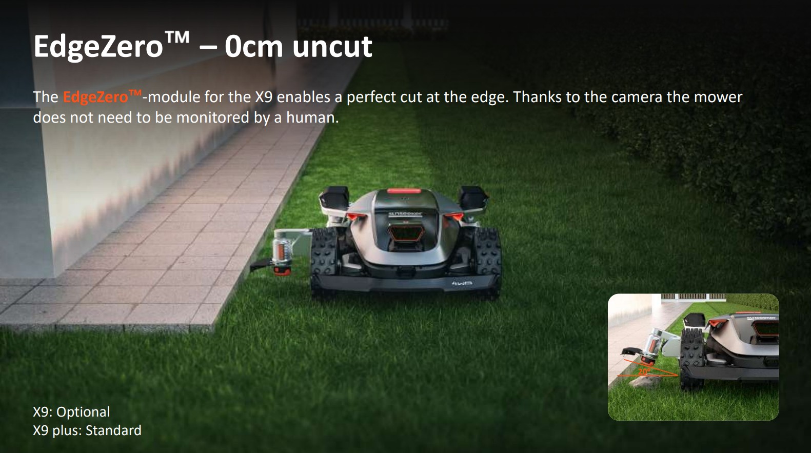 Sunseeker X9 voidaan varustaa EdgeZero-reunaleikkuujärjestelmällä, joka mahdollistaa erittäin tarkan leikkuun nurmikon reunoissa.