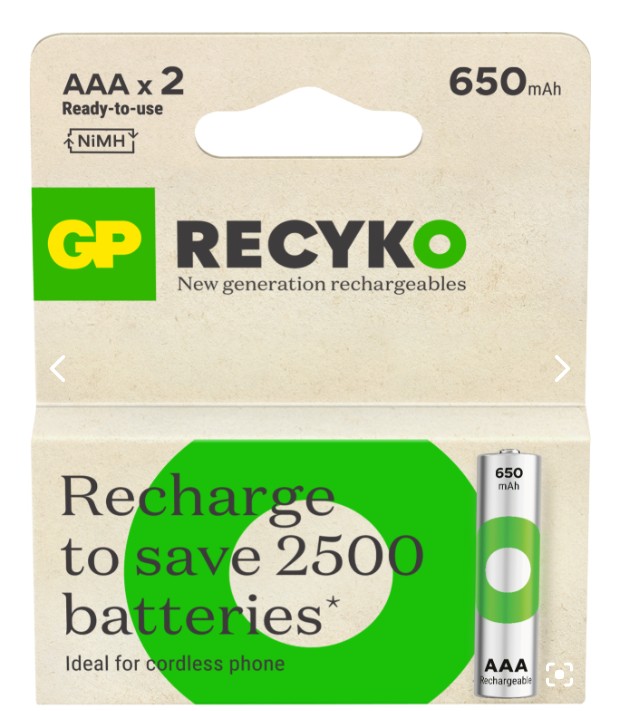 Rechargeable battery AAA/R03, 1.2V, 650 mAh, ReCyko, 2pcs., GP